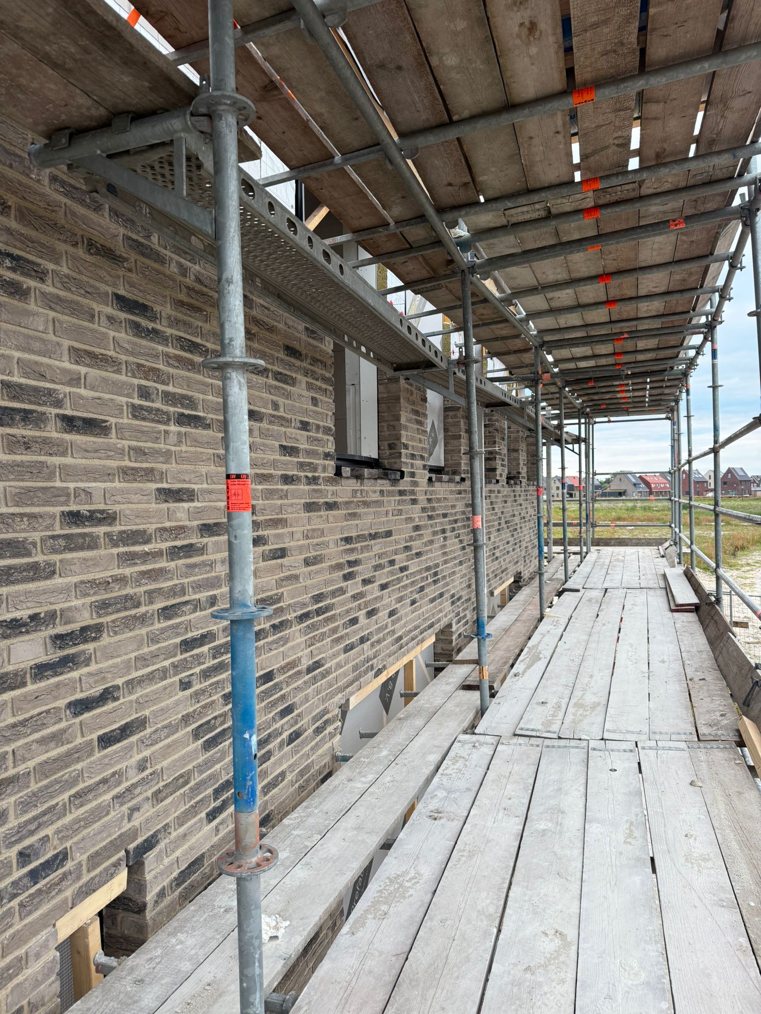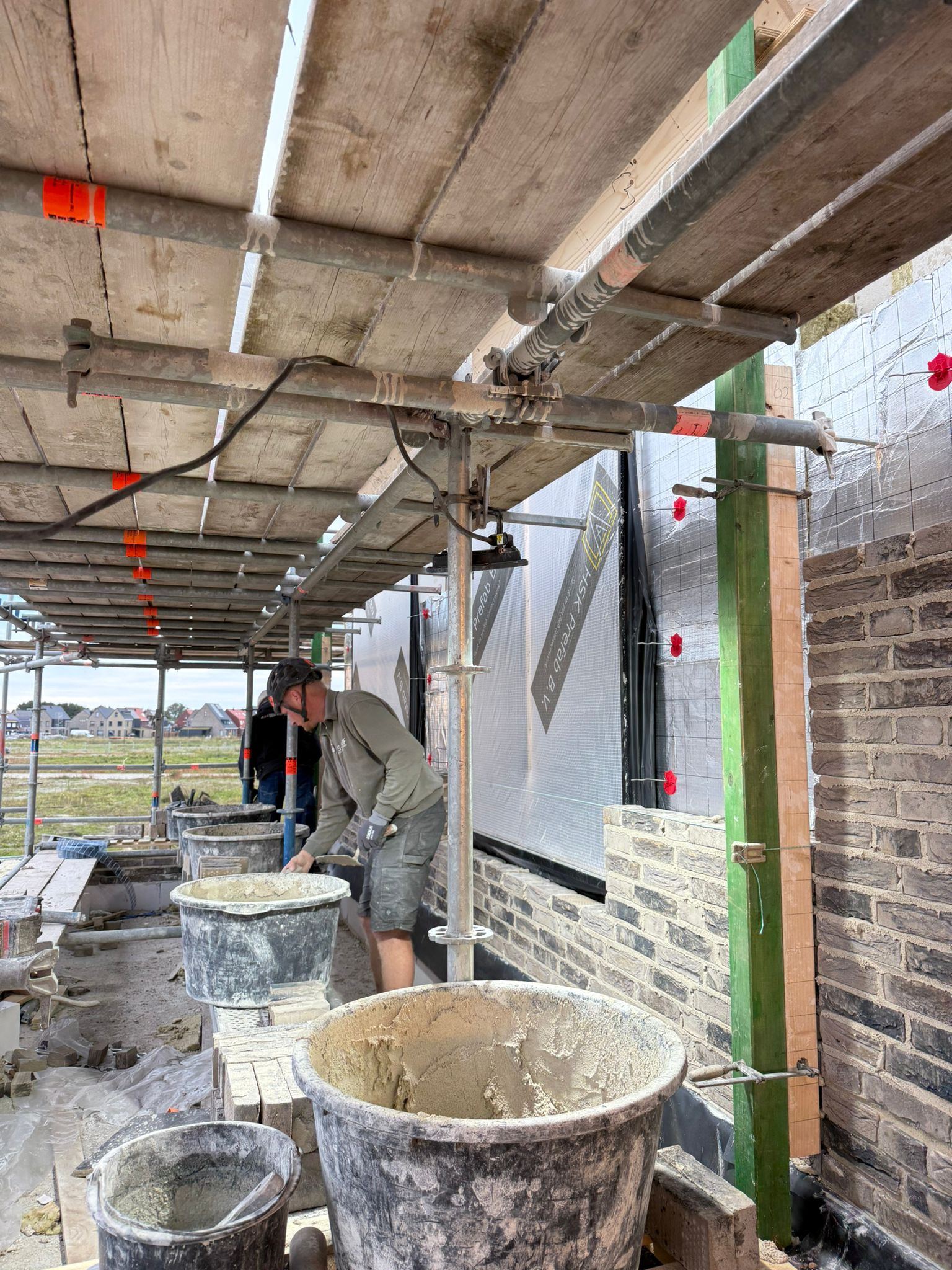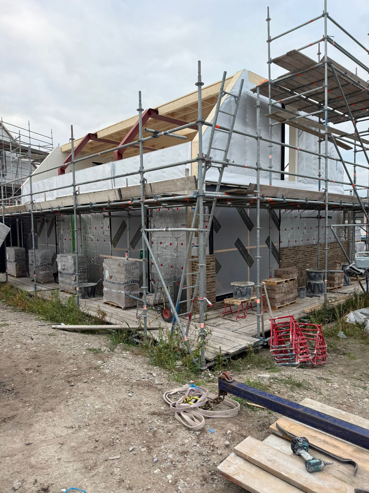In opdracht van Van Braam-Minnesma verzorgde MetselCompany Volendam het complete metselwerk, de isolatie en het voegwerk. In totaal werden 300.000 stenen verwerkt en 4.000 m² isolatie aangebracht. Alles werd strak doorgestreken voor een verzorgd eindresultaat. De gevels zijn uitgevoerd in wildverband, met staandverband als subtiel accent – details die bijdragen aan de warme, dorpse uitstraling van het geheel.